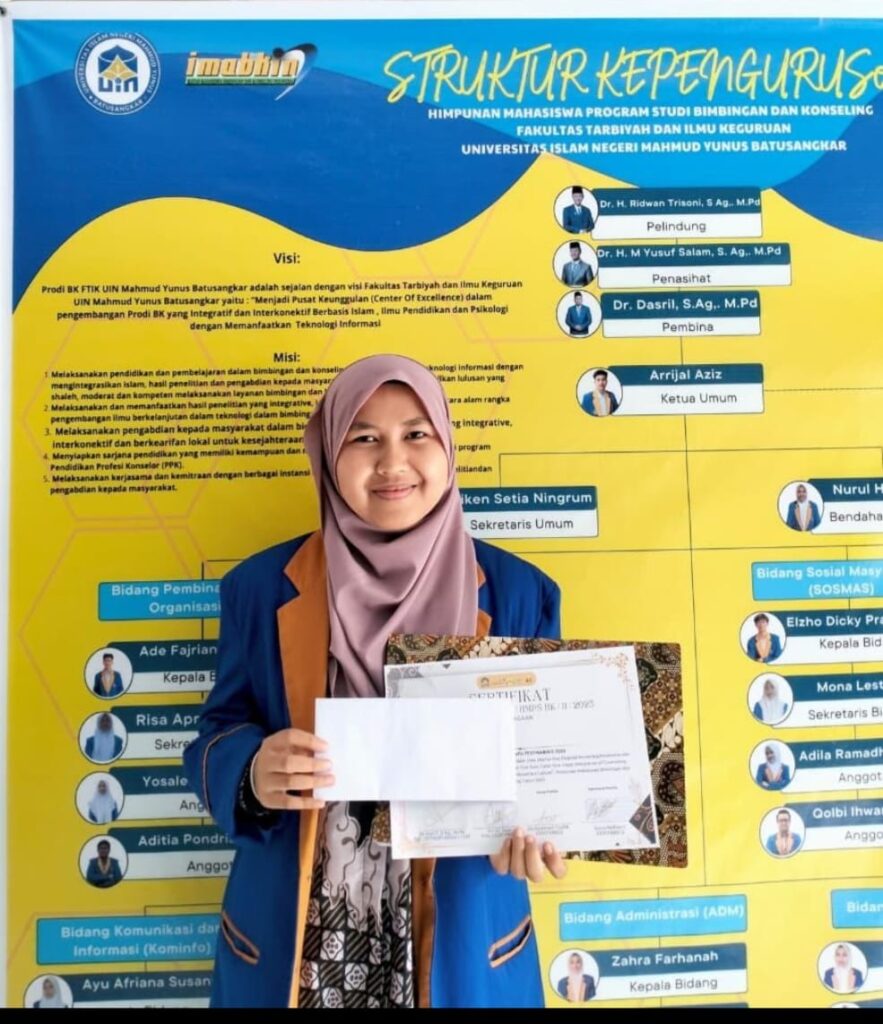 Batusangkar, 21 November 2025 – Kabar membanggakan kembali datang dari Prodi PGMI UIN Mahmud Yunus Batusangkar! Fuji Lestari, mahasiswi PGMI yang kreatif dan penuh eksplorasi, berhasil meraih Juara 1 Lomba Fotografi Tingkat Internasional pada ajang FESTMABIKO 2025 yang digelar oleh HMPS BK. Fuji berkompetisi dengan 22 peserta dari berbagai kampus, termasuk UIN Mahmud Yunus Batusangkar, UIN Suska Riau, hingga universitas dari luar negeri.